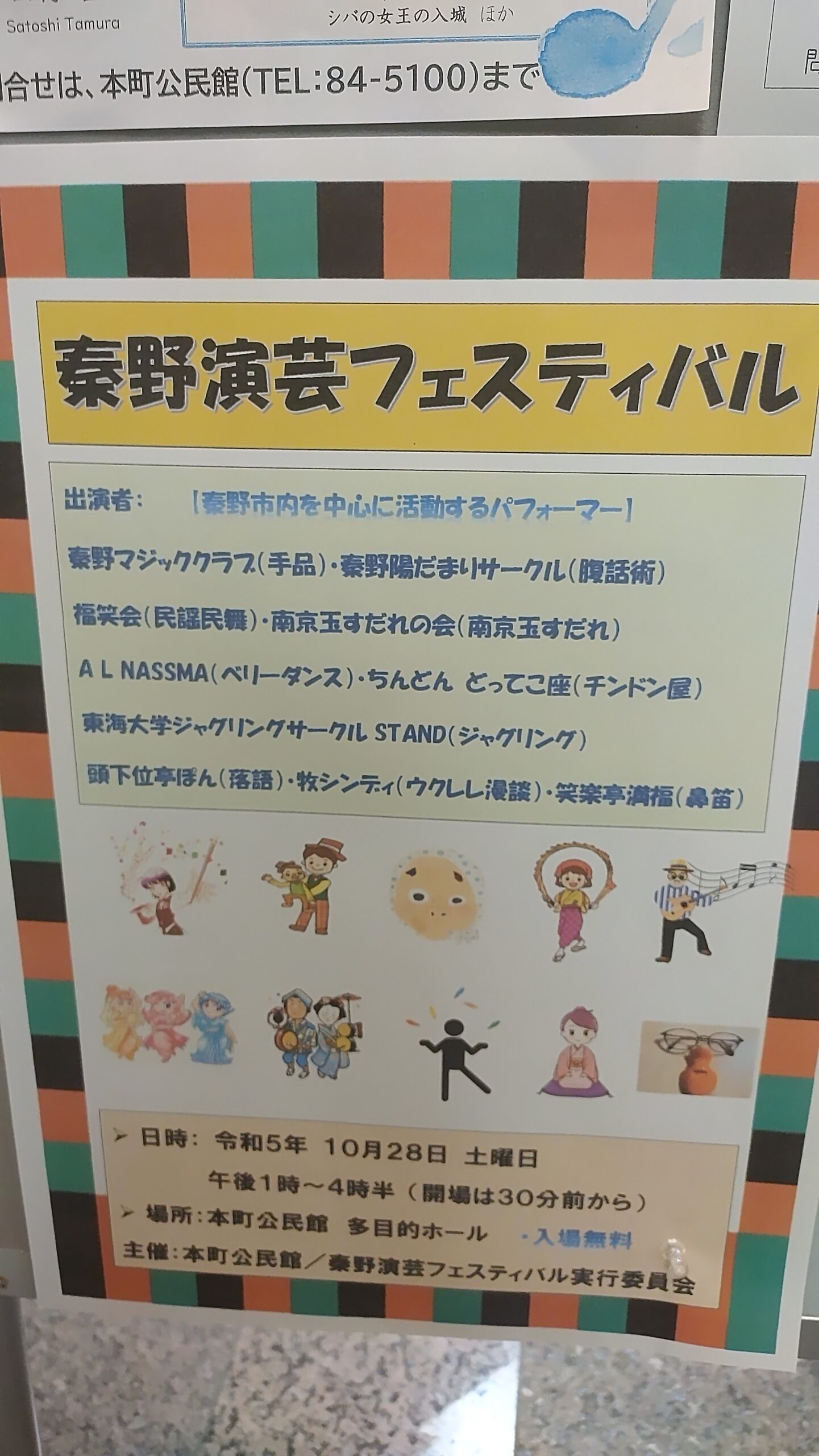 さて今週の土曜日は イベント情報 2023.10.26秦野市の本町公民館での演芸フェスティバルにちんどんどってこ座は出演いたします。団員一同一期一会を大切に皆様にお会い出来ること楽しみにしております。ちんどん屋ってなに?見たことない!逆に懐かしいーと思われる方々入場無料ですので是非お足をお運びくださいませ。DSC_0017